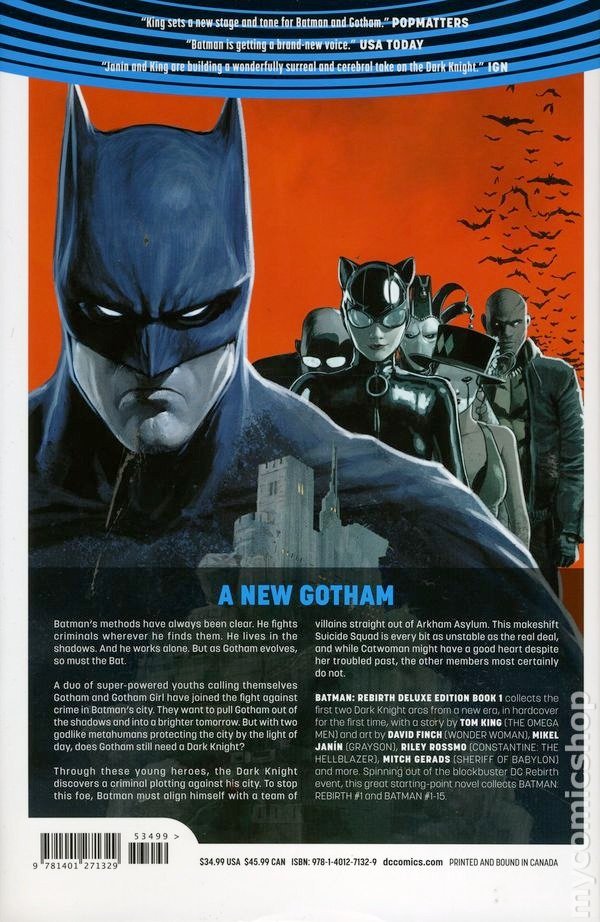 In the wake of DC UNIVERSE: REBIRTH, Batman faces his most challenging foe ever-the idealistic hero known as Gotham, who wants to save the city from Batman himself! Then, in order to retrieve Psycho-Pirate and save Gotham Girl, Batman must recruit a team from Amanda Waller to break into the most impenetrable prison in the world and steal from one of the Dark Knight's greatest foes...Bane. The next great Batman story begins here!