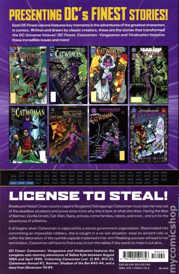 1st printing. Collects Catwoman (1993-2001 2nd Series) #0 and 13-32, Catwoman (1993-2001 2nd Series) Annual #2; Batman: Shadow of the Bat (1992-2000) #43-44; and a story from Showcase 95 (1995) #4. Written by Doug Moench, Jo Duffy, Chuck Dixon, Deborah Pomerantz, Alan Grant, Jordan B. Gorfinkel, and Deborah Pomerantz. Art by Jim Balent, Barry Kitson, Bob Smith, Dick Giordano, James A. Hodgkins, and Terry Austin. Cover by Jim Balent. License to Steal! Breakouts! Heists! Burglaries! Kidnappings! Catwoman must claw her way out of the deadliest capers and prove once more why she is best at what she does. Facing the likes of Batman, Gorilla Grodd, Robin, Catman, Nazis, princes, and more...she's in for the adventures of a lifetime. It all begins when Catwoman is captured by a secret government organization. Blackmailed into committting an impossible robbery, she is caught in a no-win situation: steal an ancient relic or suffer the detonation of the cyanide capsule implanted in her arm! Realizing success will lead to her termination, Catwoman will have to find a way to turnthe tables if she wants to make it out alive! Includes many never-before collected tales! Softcover, 624 pages, full color. Teen Cover price $39.99.