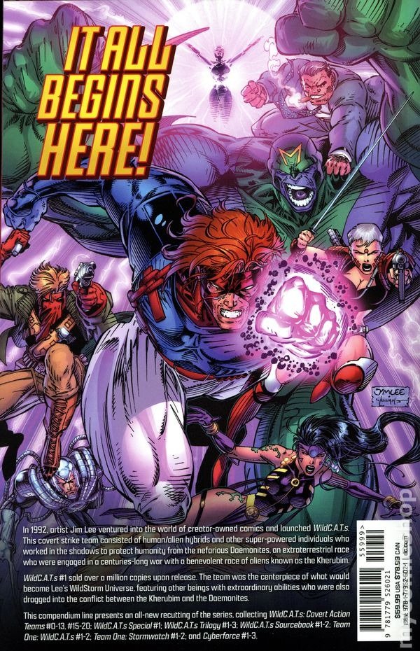 Volume 1 - 1st printing. Collects WildCATs: Covert Action Teams (1992-1998 Image) #0-13 and 15-20; Team One: WildCATs (1995) #1-2, Team One: StormWatch (1995) #1-2, WildCATs :Covert Action Teams Special (1993), WildCATs Trilogy (1993) #1-3, WildCATs Sourcebook (1993) #1-2, and Cyberforce (1993-1997 2nd Series) #1-3. Written by Brandon Choi, Jim Lee, Chris Claremont, James Robinson, Steve Gerber, Dafydd Wyn, Eric Silvestri, and Marc Silverstri. Art by Jim Lee, Brett Booth, Travis Charest, Jae Lee, Marc Silvestri, Scott Williams, Alex Garner, Al Vey, Troy Hubbs, Richard Bennett, Michael Fecci, John Dickinson, Rich Johnson, and John Tighe. Cover by Jim Lee and Scott Williams. In 1992, Jim Lee launched WildC.A.T.s, a covert strike team consisting of human/extraterrestrial hybrids and other super-powered individuals who worked in the shadows to protect humanity from the nefarious Daemonites. This compendium series presents an all-new recutting of the saga! Softcover, 952 pages, full color. Teen Cover price $59.99.