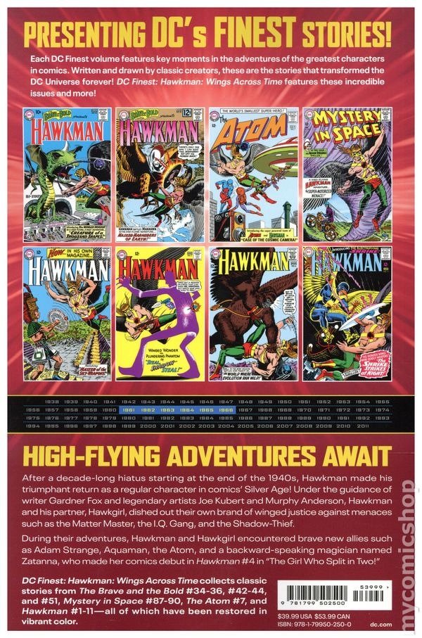 1st printing. Collects stories from The Brave and the Bold (1955-1983 1st Series DC) #34-36, 42-44, and 51; Hawkman (1964-1968 1st Series) #1-11; Mystery in Space (1951-1981 1st Series) #87-90; and The Atom (1962-1969) #7. Written by Gardner Fox and Bob Haney. Art by Murphy Anderson, Joe Kubert, Gil Kane, Howard Purcell, and Carmine Infantino. Cover by Joe Kubert. HAWKMAN AND HAWKGIRL SOAR INTO THE PAGES OF DC FINEST! Art by Joe Kubert, Murphy Anderson, Carmine Infantino and More. After a decade-long hiatus starting at the end of the 1940s, Hawkman returned as a regular character in comics' Silver Age. Under the guidance of writer Gardner Fox and legendary artists such as Joe Kubert and Murphy Anderson, Hawkman and his partner, Hawkgirl, dished out their own brand of winged justice against menaces such as the Matter Master and the Shadow Thief. This volume collects the classic Silver Age stories! Softcover, 6-in. x 9-in., 560 pages, full color. Teen Cover price $39.99.