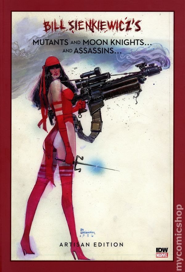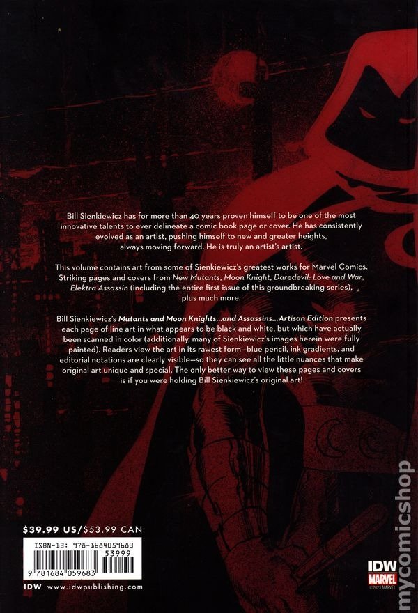 1st printing. Written by Chris Claremont, Frank Miller, and Doug Moench. Art and cover by Bill Sienkiewicz. Bill Sienkiewicz is renowned for his work on some of Marvel's most iconic comics of the 1980s: Moon Knight, The New Mutants, Elektra: Assassin, and more. This collection is filled with some of his finest covers, pin-ups, and pages. Included in this Artisan Edition is the oversized first issue of Elektra: Assassin, written by Frank Miller, as well as many gorgeous pages from that acclaimed series. All have been meticulously scanned from the original art and reproduced to the exacting Artist's Edition standards. While appearing to be in black and white, these images have been scanned in color, allowing the reader to view them as closely as possible to the original art. Ink gradients, blue pencil, corrections, and more are all clearly visible, all the wonderful subtle nuances that make original art so special and unique. Softcover, 8-in. x 12-in., 172 pages, B&W. Cover price $39.99.