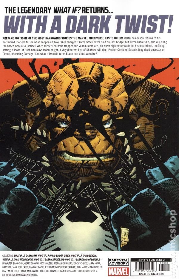 1st Printing. Collects What If Dark Carnage (2023 Marvel) #1, What If Dark Loki (2023 Marvel) #1, What If Dark Moon Knight (2023 Marvel) #1, What If Dark Spider-Gwen (2023 Marvel) #1, What If Dark Venom (2023 Marvel) #1, and What If Dark Tomb of Dracula (2023 Marvel) #1. Written by Walter Simonson, Stephanie Phillips, Larry Hama, Gerry Conway, Jody Houser, Erica Schultz, and Marv Wolfman. Art by Scot Eaton, John McCrea, Jethro Morales, Edgar Salazar, Ramon F. Bachs, and David Cutler. The legendary series returns, with a dark twist! Prepare for some of the most harrowing stories the Marvel Multiverse has to offer! Walter Simonson returns to his acclaimed Thor era to see what happens if Loki takes charge! If Gwen Stacy never died on that bridge, but Peter Parker did, who will bring the Green Goblin to justice? When Mister Fantastic trapped the Venom symbiote, his worst nightmare would be his best friend, the Thing, setting it loose! If Bushman slays Moon Knight, a very different Fist of Khonshu will rise! Ponder Cortland Kasady, long-dead ancestor of Cletus, becoming Carnage! And what if Dracula turns Blade into a full vampire? Softcover, 200 pages, full color. Cover price $29.99.